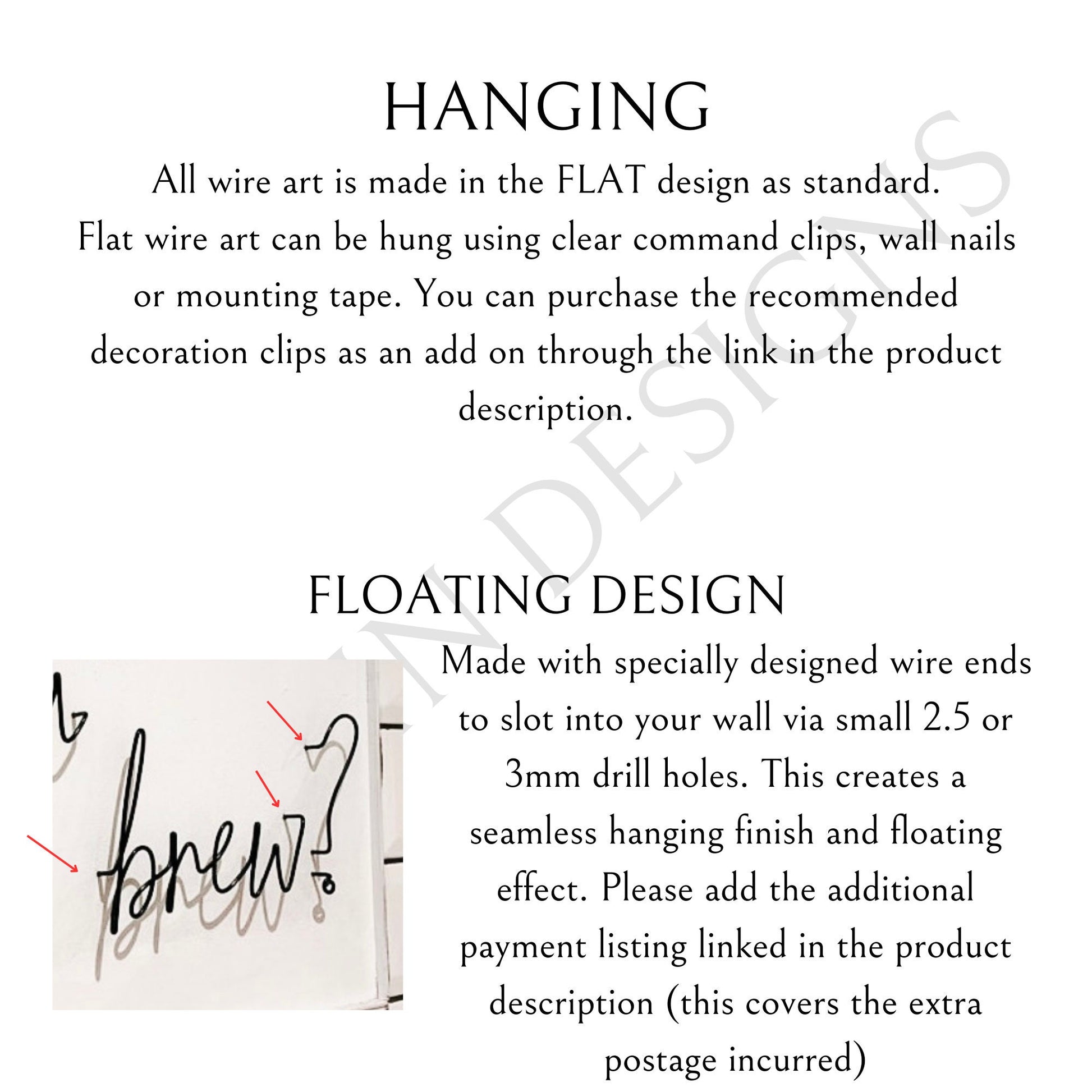 Wire art will be made in the 'flat' design as standard. Flat wire art can be hung using clear decoration clips, wall nails or mounting tape. Flat is favourable to those wanting a damage free hanging option. You can purchase the recommended decoration clips as an add on through my link here (not compulsory):