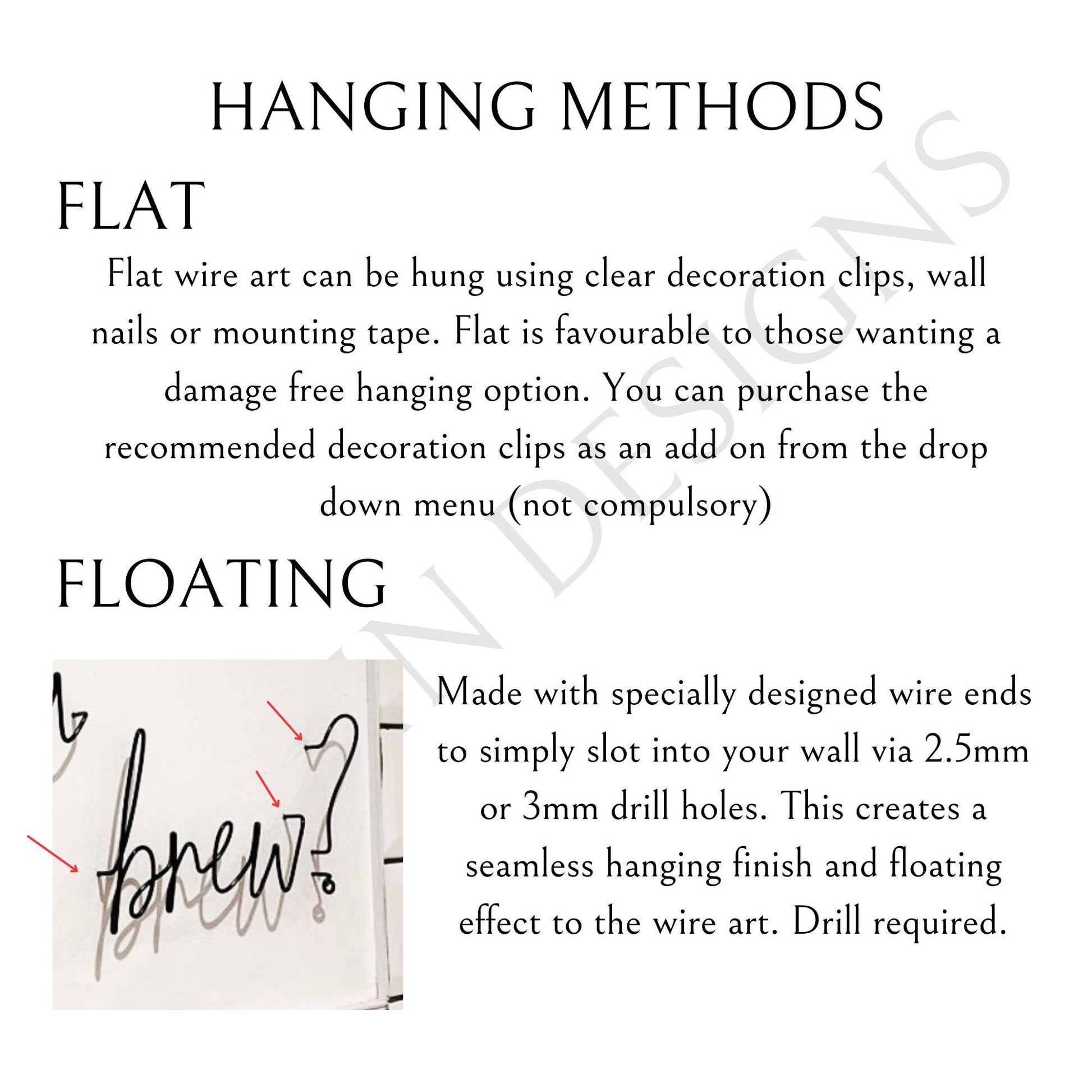 Flat wire art can be hung using clear decoration clips, wall nails or mounting tape. Flat is favourable to those wanting a damage free hanging option. You can purchase the recommended decoration clips as an add on through my link here (not compulsory):